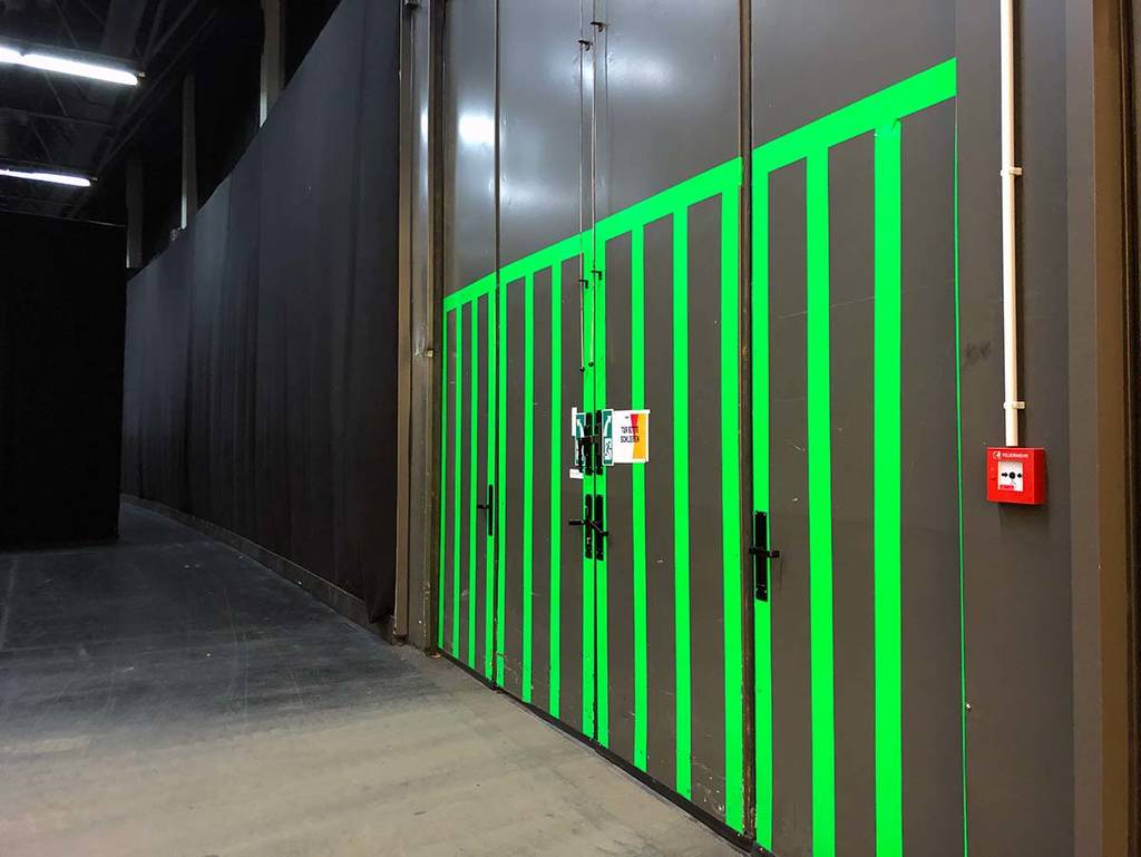 Hinter der Bühne muss man besonders vorsichtig sein, denn es liegen überall Kabel und Werkzeug herum und man könnte jemanden verletzen.