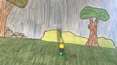 Wir haben pantomimisch Requisiten von den Hauptpersonen dargestellt. Zum Beispiel einen Brief eine Pistole und einen Baum.